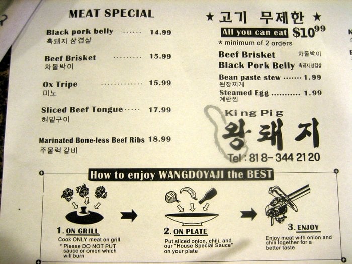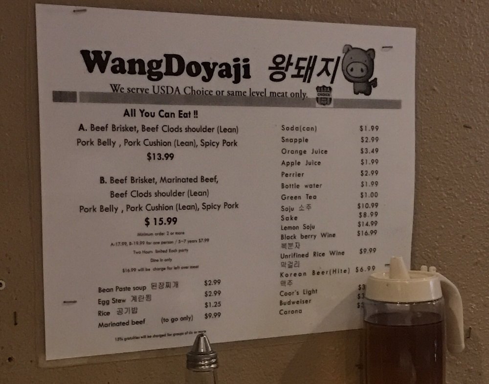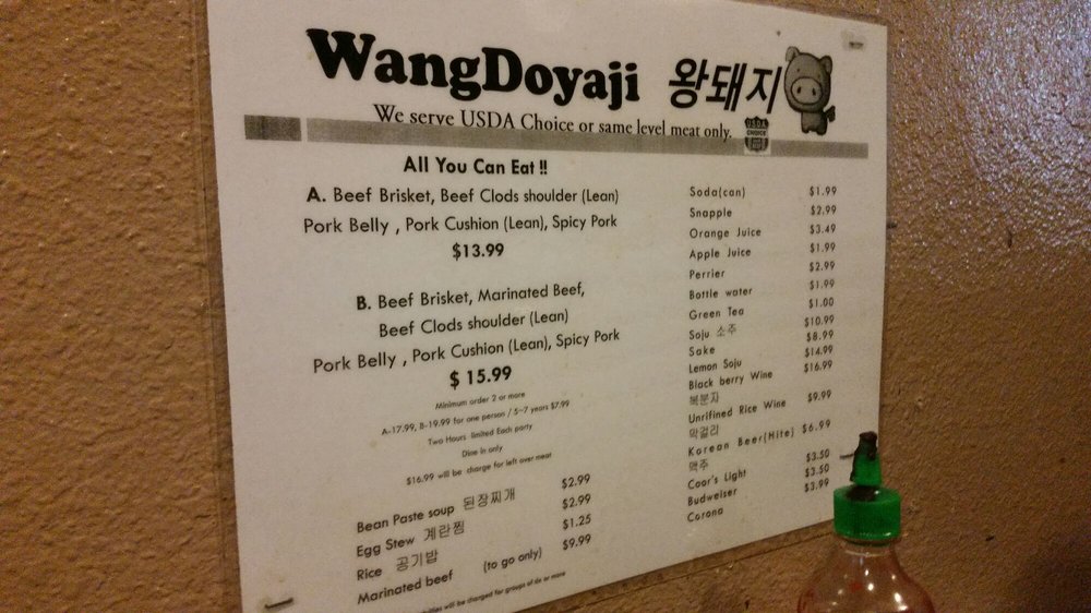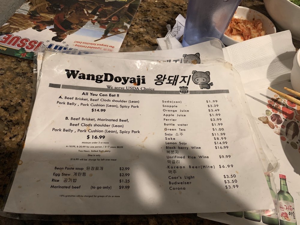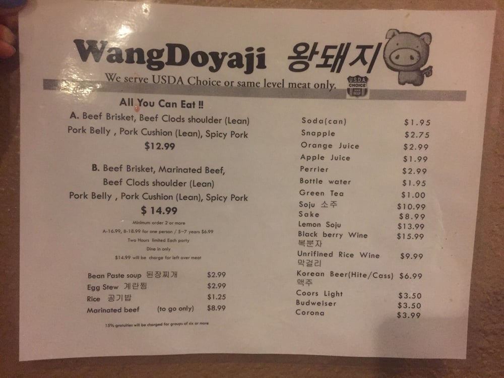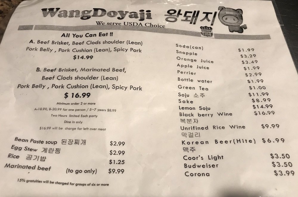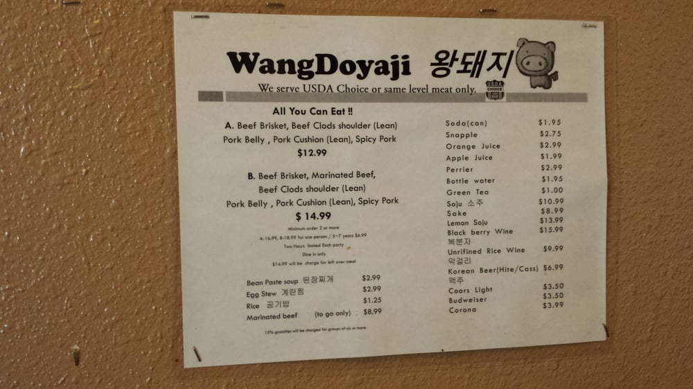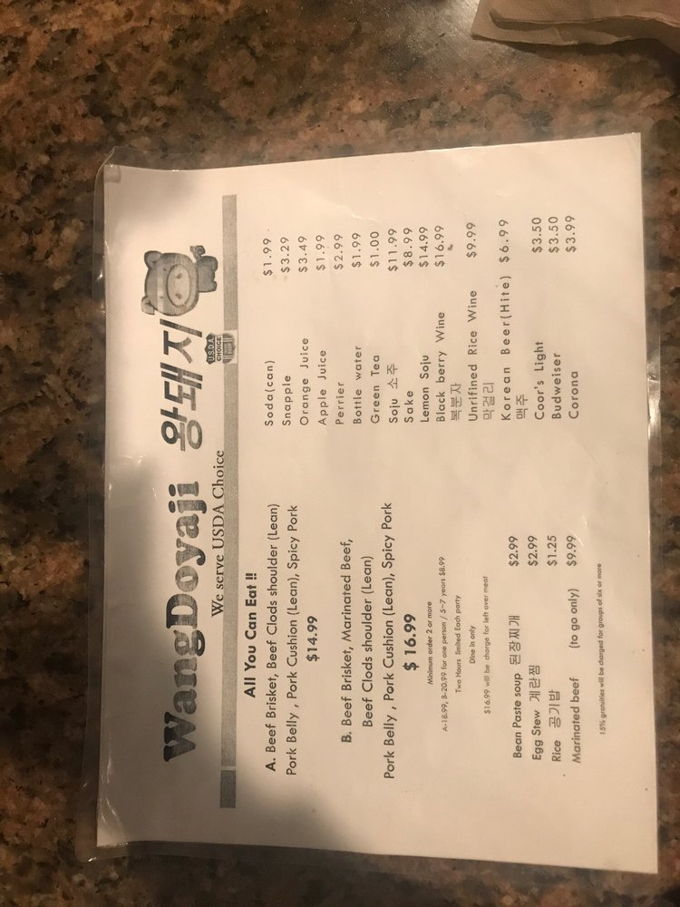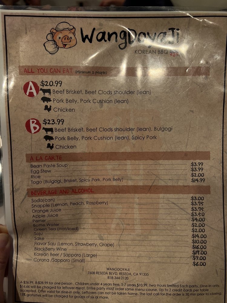 Introducing the menu at Wangdoyaji, a Korean BBQ restaurant located in Reseda, CA. Known for its friendly service and delicious meats, Wangdoyaji offers options like Bulgogi Marinated beef, Spicy Pork, and Brisket Beef. Guests rave about the salad that comes with the order and the attentive wait staff, like Adolfo and Luis, who provide top-tier customer service. The restaurant is praised for its quick service, reasonable prices, and cozy atmosphere. Wangdoyaji also caters to vegetarians and offers a variety of beverages for a complete dining experience. With positive reviews from customers like Maira, Daryuosh, Luz, Chris, and Laura, Wangdoyaji stands out as a go-to spot for Korean BBQ enthusiasts. Visit for an unforgettable meal and welcoming atmosphere.